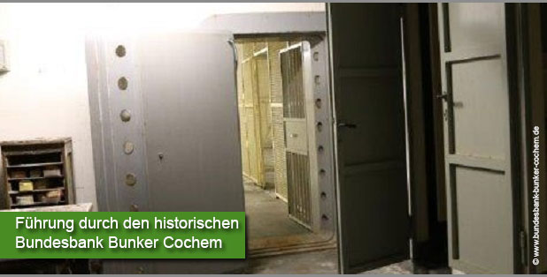 Bei Führungen durch die ehemalige Bunker- und Tresoranlage Cochem kann ein Blick hinter die Kulissen dieses einmaligen unterirdischen Komplexes geworfen werden. Die Besucher lernen hier die Notfallwährung kennen, sie erleben das Vorgehen der Deutschen Bundesbank, um die gesamten im Umlauf befindlichen D-Mark-Noten sicher und zügig auszutauschen – es können Millionen von D-Mark quer durch Deutschland versendet werden. Es gibt auch die Möglichkeit, die Vorkehrungen kennenzulernen, um im Bunker 14 Tage völlig unabhängig von der Außenwelt zu arbeiten. Jeder Besuch ist ein Erlebnis.