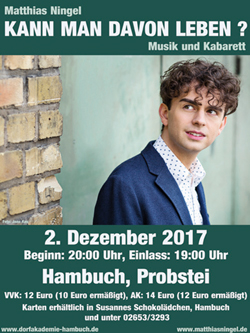 Endlich ist es wieder so weit. Matthias Ningel hat sein neues Kabarettprogramm fertig und stellt es, wie versprochen zuallererst bei uns in Hambuch vor. Der Hambucher Künstler ist mit zahlreichen Preisen dekoriert und konnte sogar die deutsche Kabarettmeisterschaft gewinnen. Wir freuen uns, Euch die Vor-premiere seines neuen Bühnenprogramms anbieten zu können und laden ein zu